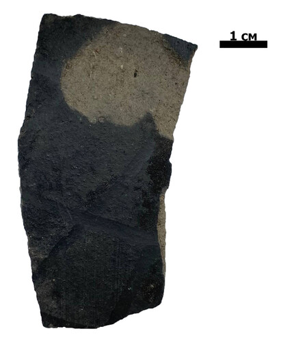 Фрагмент стенки горшка лощёного, чёрнодымленного. Найден на территории Малого замка в Новогрудке. Раскопки А.А. Добриянов, 2000 г.